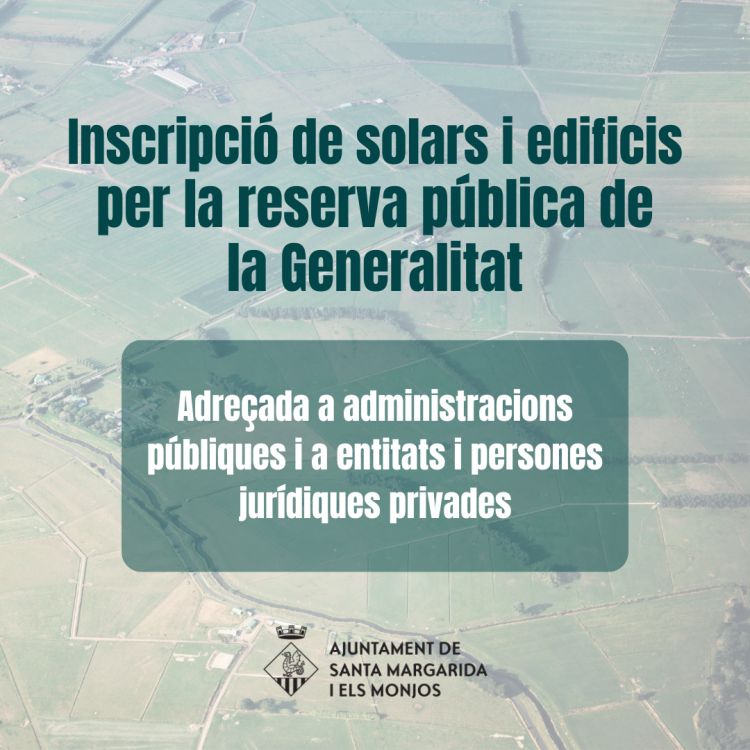 L’Ajuntament de Santa Margarida i els Monjos informa que la Generalitat ha obert la convocatòria 2026 per inscriure solars a la reserva pública de solars per incrementar l’oferta d’habitatge protegit i facilitar l’accés a ajuts per a la seva promoció.